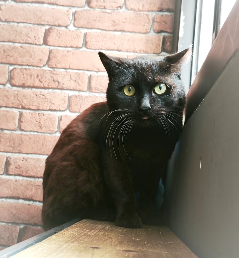 Este negrito nos tiene enamoradas. Espera con impaciencia nuestra llegada para darle su ración de cariñitos que prioriza sobre su latita. Ansía encontrar un hogar y un dueño al que adorar.